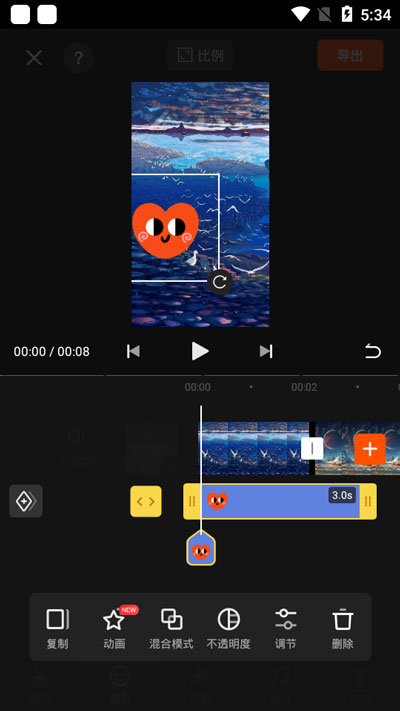 5.找到贴纸之后,在下方的贴纸时间轴上,延长贴纸出现的时间,避免贴纸一闪而过,最后点击【导出】即可;