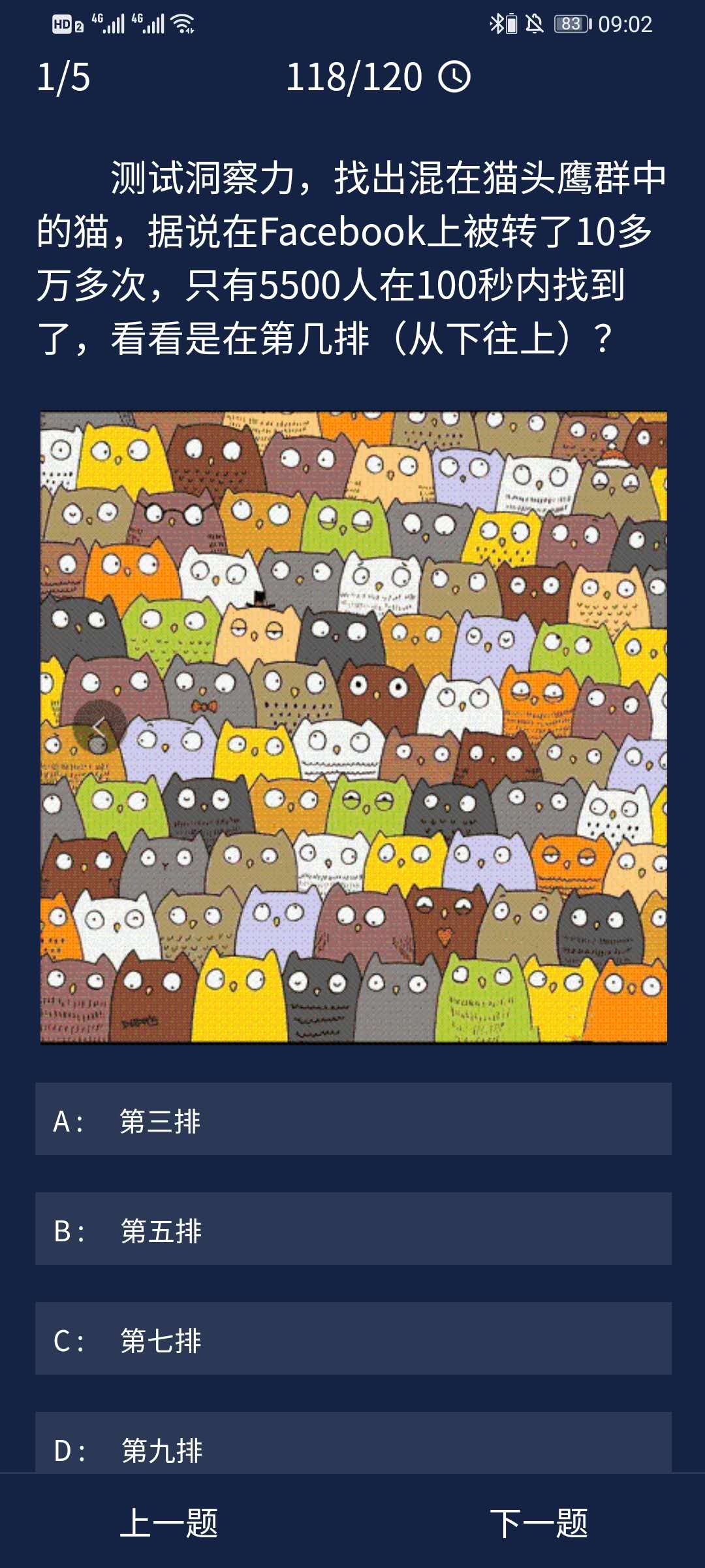 1、测试洞察力,找出混在猫头鹰群中的猫,据说在Facebook上被转了10多万多次,只有5500人在100秒内找到了,看看是在第几排(从下往上)?