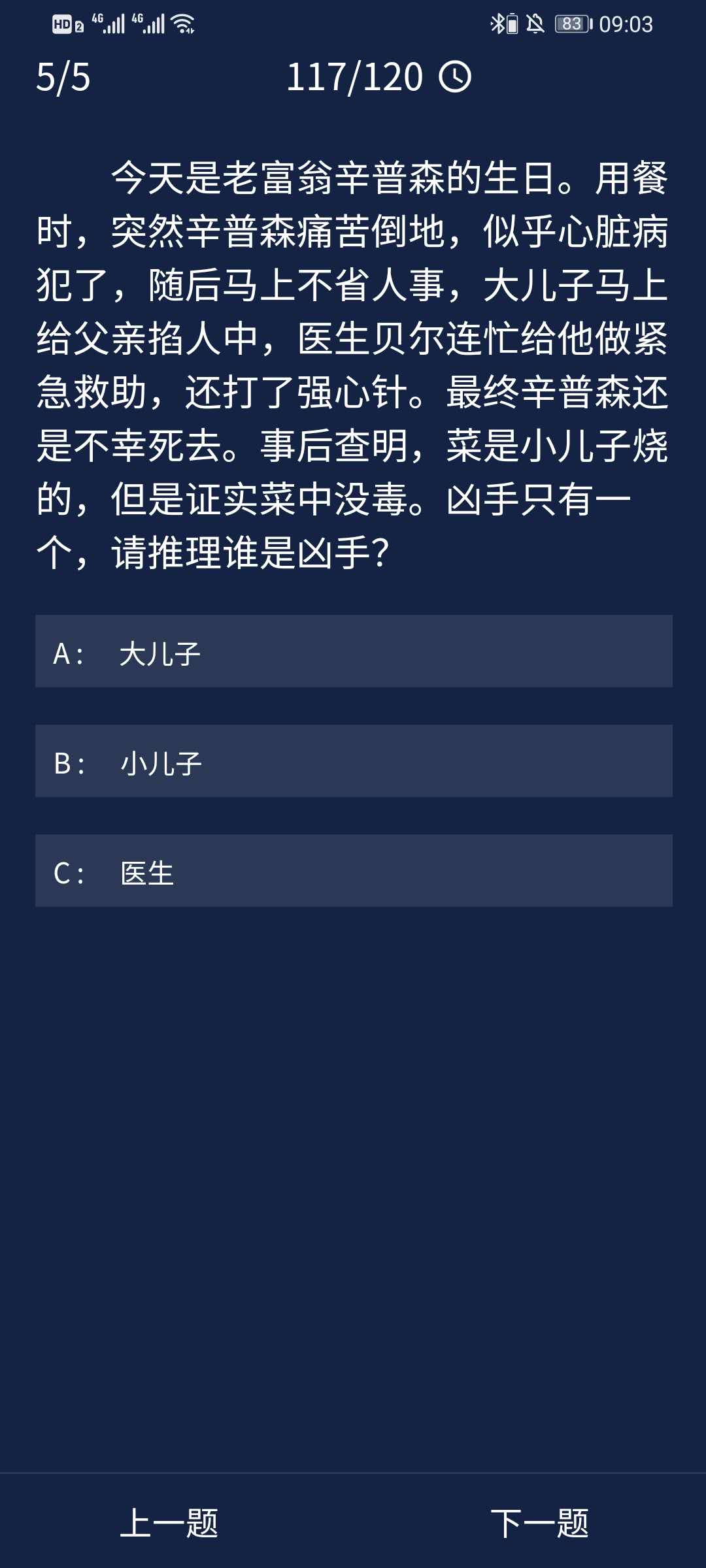 答案解析:心脏病患者是不能乱打强心剂的。心脏病掐人中也是不行的,但是作为外行人的儿子可能不太懂,而医生知道却不制止他,所以医生是凶手。