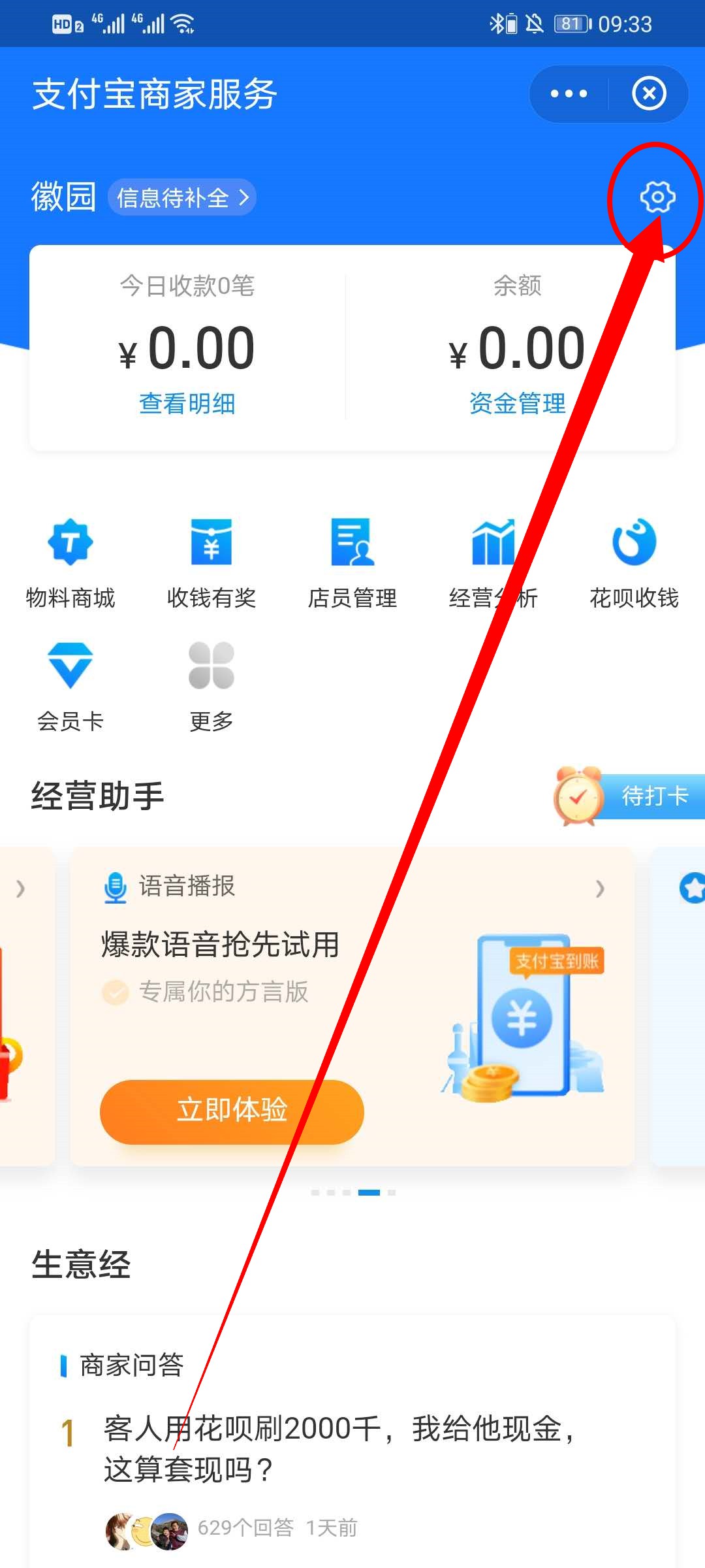 3、在支付宝商家服务界面,点击余额右上方的“齿轮形状”的设置按钮,进入设置界面。