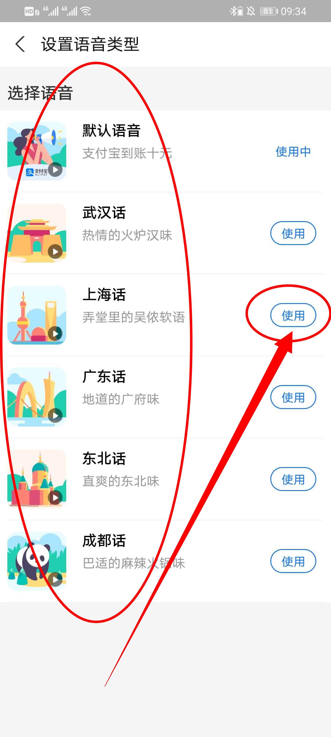 6、在设置语音类型界面,可以选择自己喜欢的方言,点击使用即可体验支付宝方言版到账提醒。