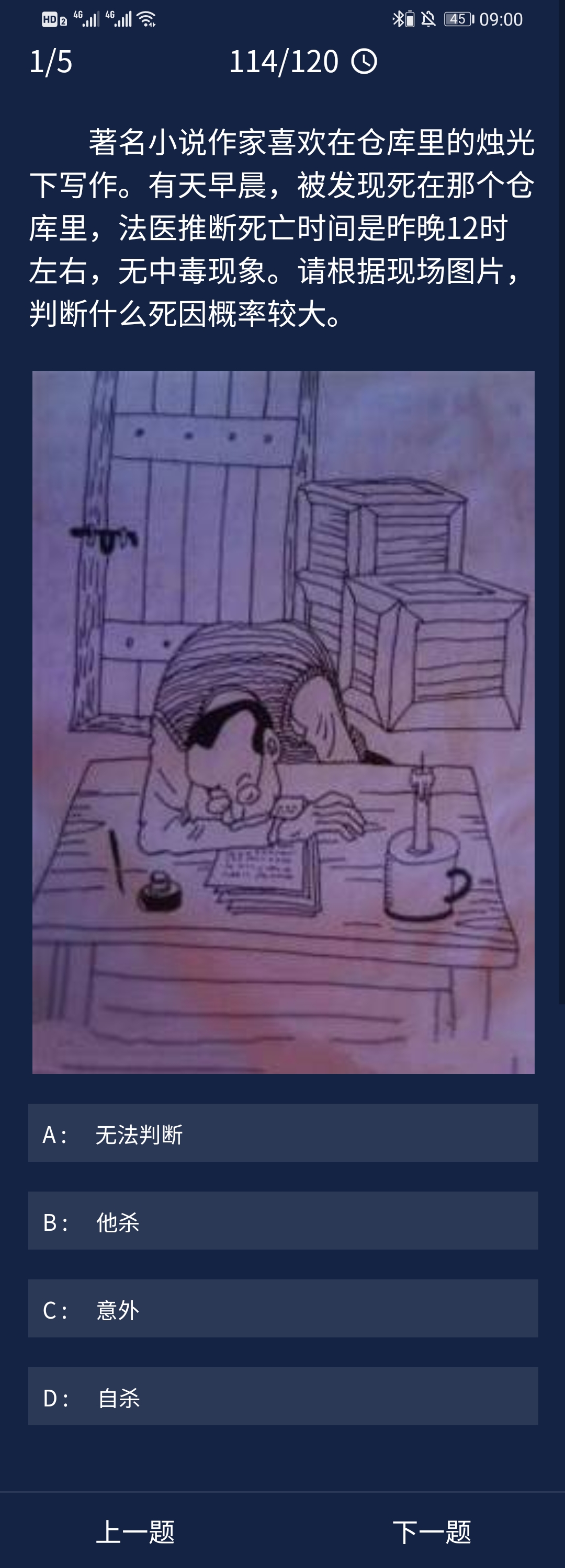 1、著名小说作家喜欢在仓库里的烛光下写作。有天早晨,被发现死在那个仓库里,法医推断死亡时间是昨晚12时左右,无中毒现象。请根据现场图片,判断什么死因概率较大。