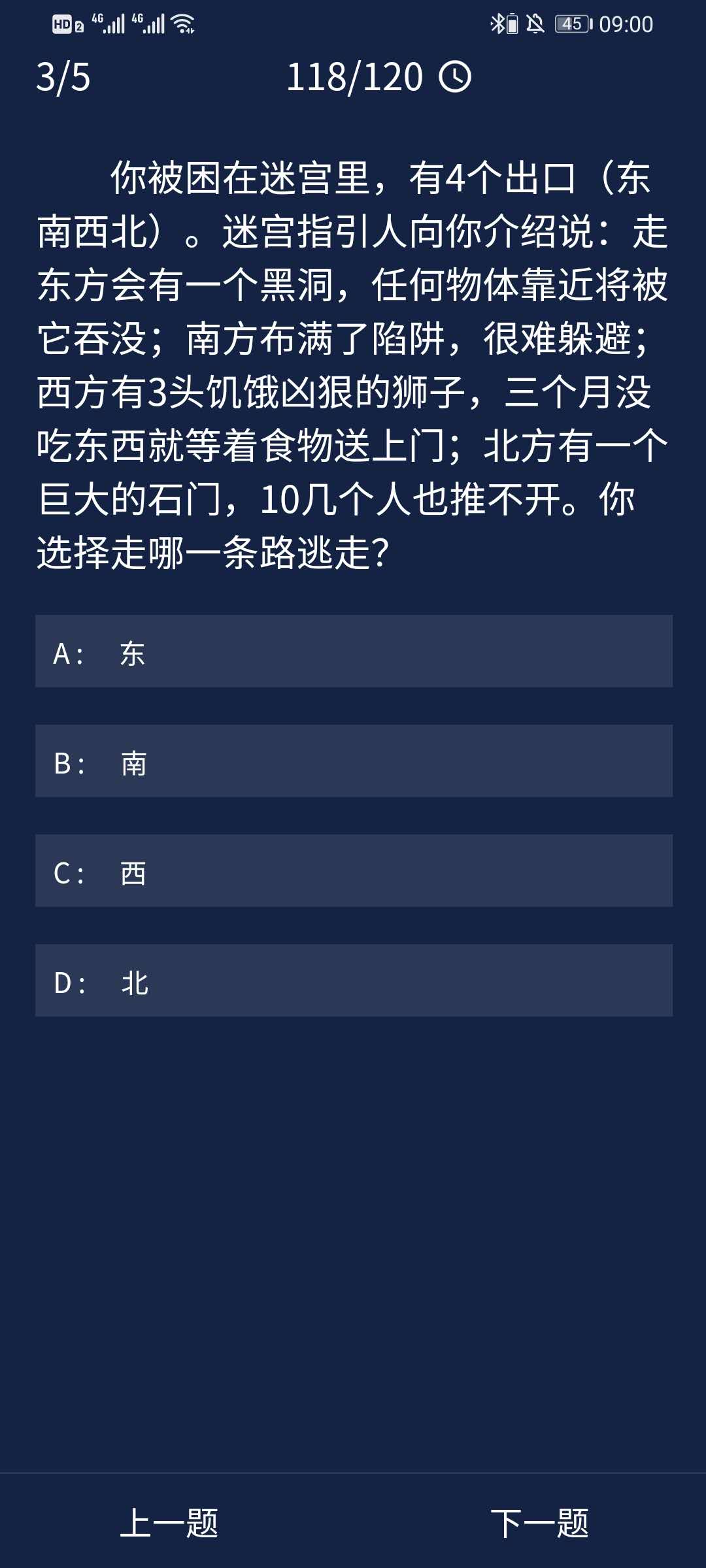 3、你被困在迷宫里,有4个出口(东南西北)。迷宫指引人向你介绍说:走东方会有一个黑洞,任何物体靠近将被它吞没;南方布满了陷阱,很难躲避;西方有3头饥饿凶狠的狮子,三个月没吃东西就等着食物送上门;北方有一个巨大的石门,10几个人也推不开。你选择走哪一条路逃走?