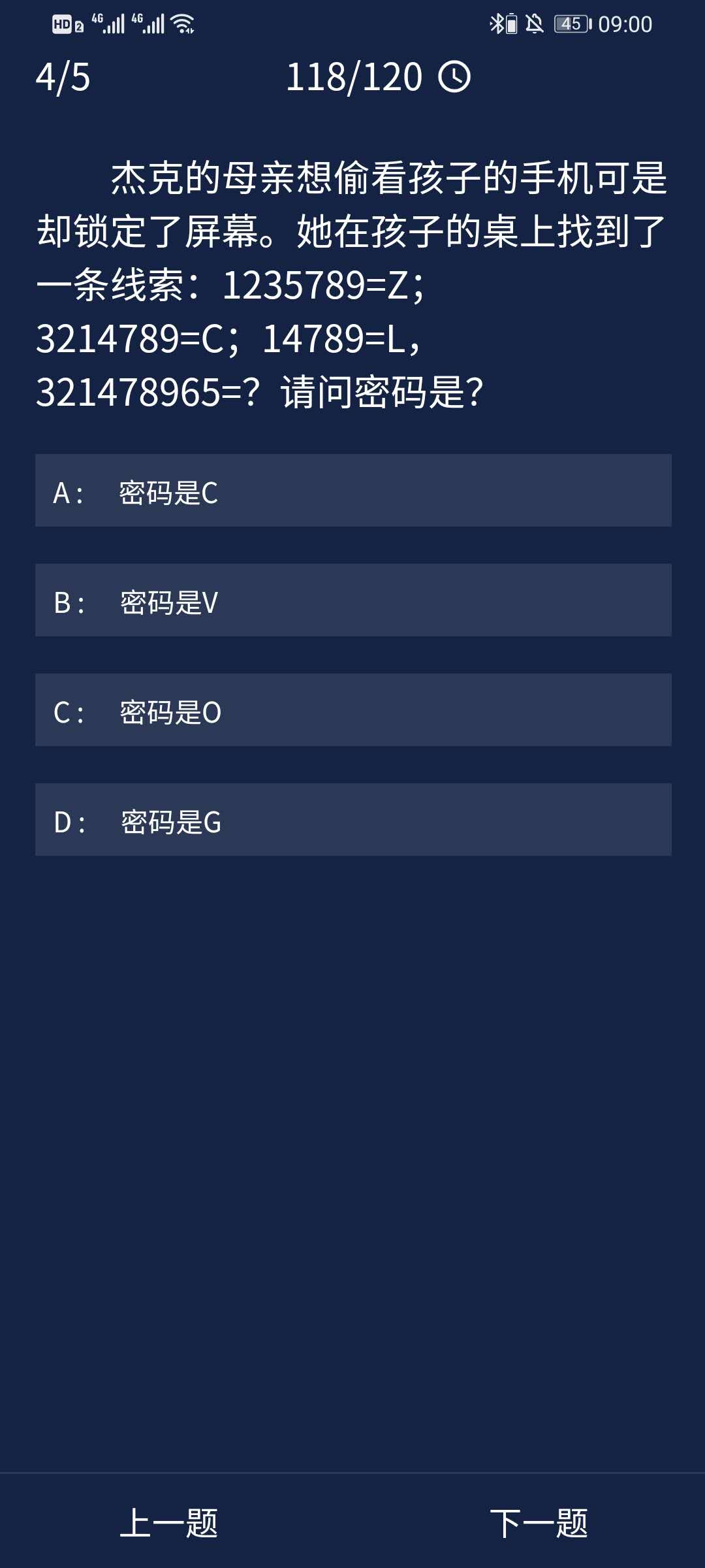 4、杰克的母亲想偷看孩子的手机可是却锁定了屏幕。她在孩子的桌上找到了一条线索:1235789=Z;3214789=C; 14789=L,321478965=?请问密码是?