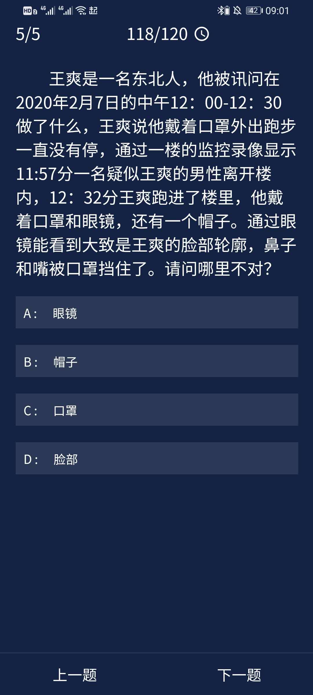 5、王爽是一名东北人,他被讯问在2020年2月7日的中午12:00-12: 30做了什么,王爽说他戴着口罩外出跑步一直没有停,通过一楼的监控录像显示11:57分一名疑似王爽的男性离开楼内,12:32分王爽跑进了楼里,他戴着口罩和眼镜,还有一个帽子。通过眼镜能看到大致是王爽的脸部轮廓,鼻子和嘴被口罩挡住了。请问哪里不对?
