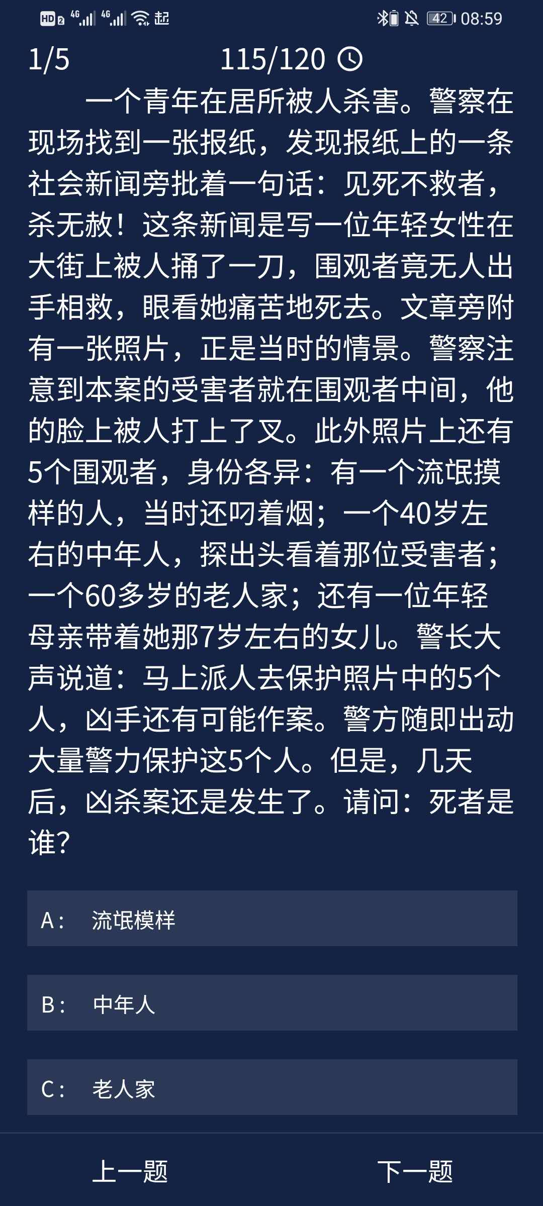 1、一个青年在居所被人杀害。警察在现场找到一张报纸,发现报纸上的一条社会新闻旁批着一句话:见死不救者,杀无赦!这条新闻是写一位年轻女性在大街上被人捅了一刀,围观者竟无人出手相救,眼看她痛苦地死去。文章旁附有一张照片,正是当时的情景。警察注意到本案的受害者就在围观者中间,他的脸上被人打上了叉。此外照片上还有5个围观者,身份各异:有一个流氓摸样的人,当时还叼着烟;一个40岁左右的中年人,探出头看着那位受害者;—个60多岁的人本的L。警长大声说道:马上派人去保护照片中的5个人,凶手还有可能作案。警方随即出动大量警力保护这5个人。但是,几天后,凶杀案还是发生了。请问:死者是谁?