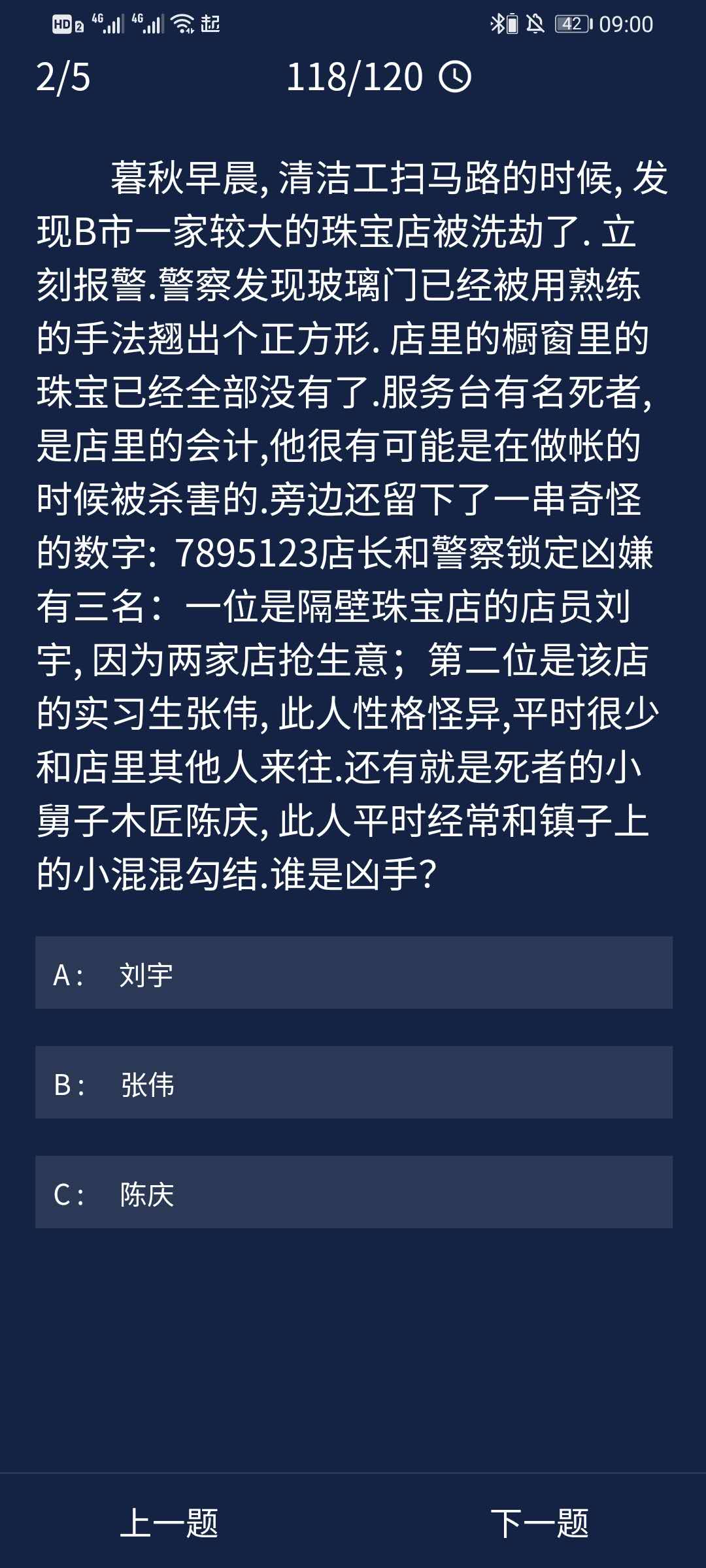 2、暮秋早晨,清洁工扫马路的时候,发现B市一家较大的珠宝店被洗劫了.立刻报警.警察发现玻璃门已经被用熟练的手法翘出个正方形.店里的橱窗里的珠宝已经全部没有了.服务台有名死者,是店里的会计,他很有可能是在做帐的时候被杀害的.旁边还留下了一串奇怪的数字:7895123店长和警察锁定凶嫌有三名:一位是隔壁珠宝店的店员刘宇,因为两家店抢生意;第二位是该店的实习生张伟,此人性格怪异,平时很少和店里其他人来往.还有就是死者的小舅子木匠陈庆,此人平时经常和镇子上的小混混勾结.谁是凶手?