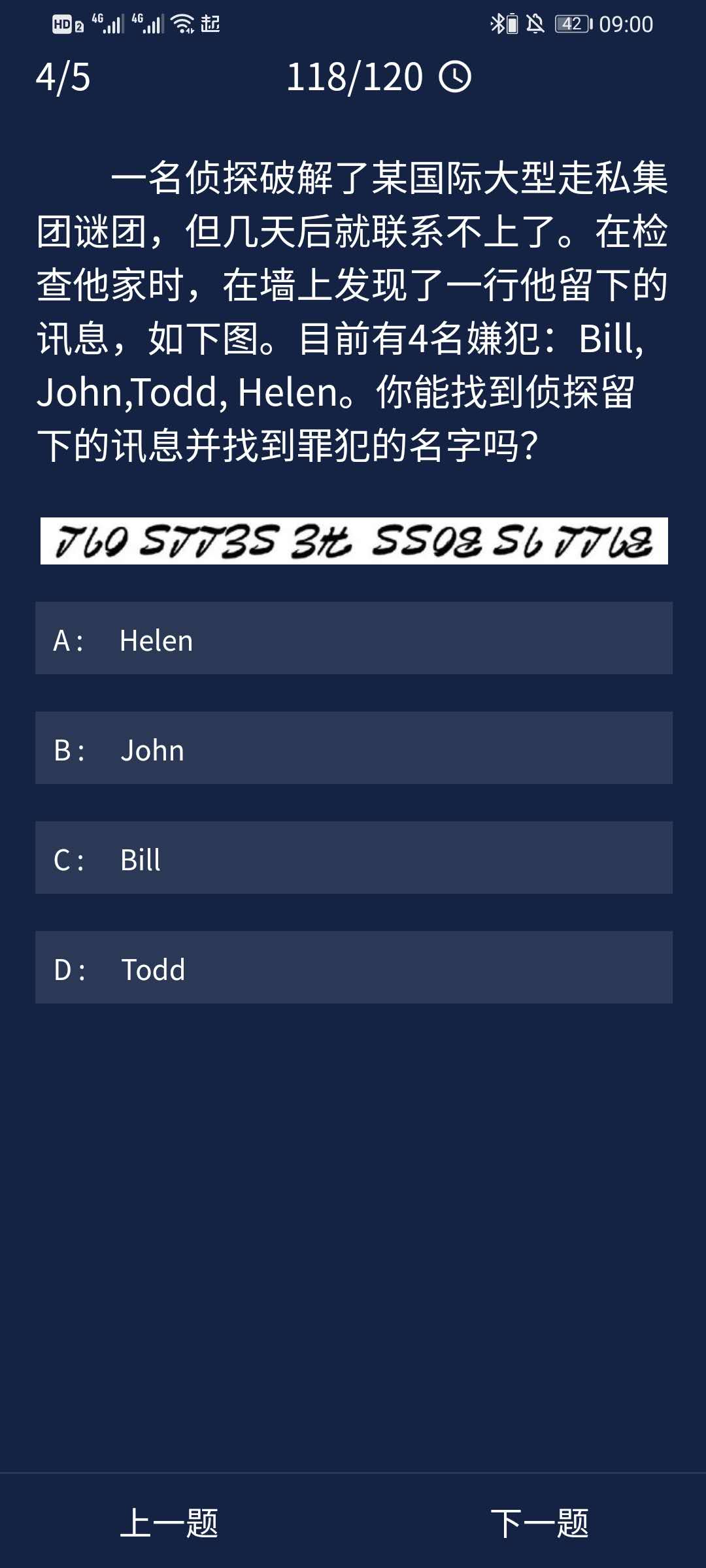 4、一名侦探破解了某国际大型走私集团谜团,但几天后就联系不上了。在检查他家时,在墙上发现了一行他留下的讯息,如下图。目前有4名嫌犯:Bill,John,Todd, Helen。你能找到侦探留下的讯息并找到罪犯的名字吗?