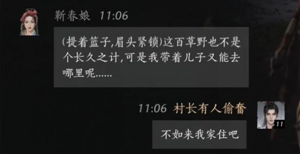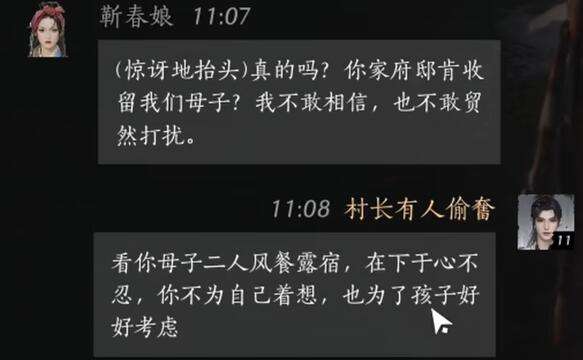 玩家:看你母子二人风餐露宿,在下于心不忍,你不为自己着想,也为了孩子好好考虑。