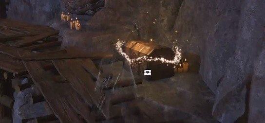 4、继续跟随任务指引,沿着木梯前进来到洞窟深处,推开木门找到第二个宝箱。