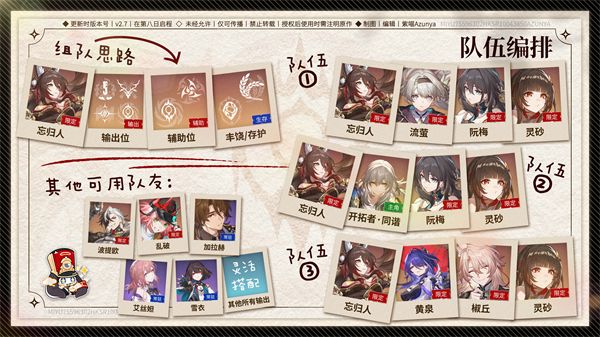 搭配亮点:这套阵容的主要目标是支持黄泉的充能和输出,虽然它并非黄泉的最优搭配,但仍能起到一定的替代作用。