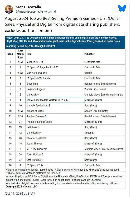 Circana的Mat Piscatella透露了2024年8月美国电子游戏和硬件的销售数据。不出所料,EA Sports的《麦登橄榄球25》荣登榜首,这标志着这个系列的新作在上市当月连续第25年占据销售排行榜的首位。