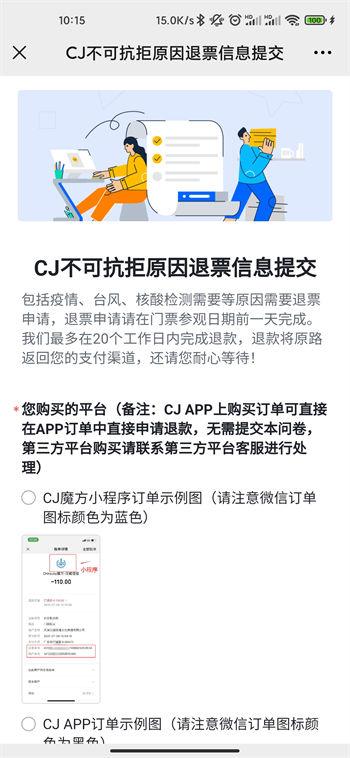 4.选择您的购买途径,出示退票信息提交,即可申请退票。