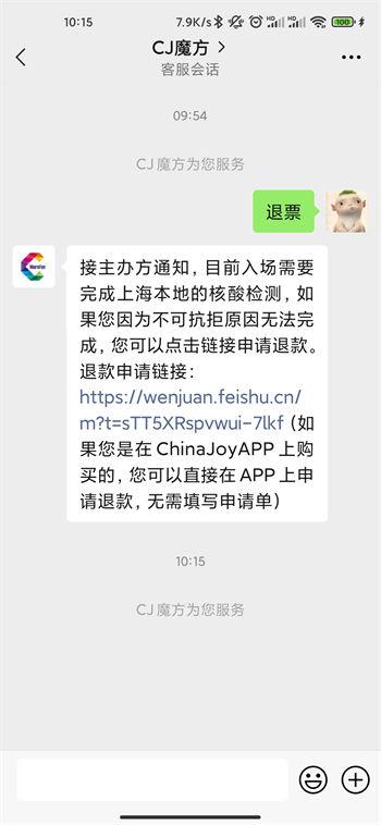 3.在打开的CJ魔方客服会话中点击“退票”,然后根据给出的申请链接点击申请退票;