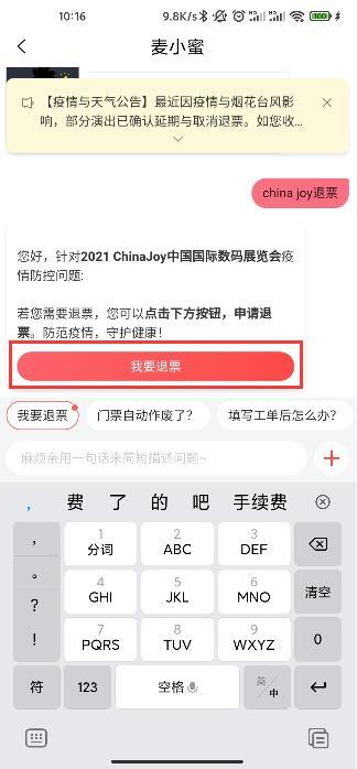 5.在麦小蜜客服页面输入“china joy退票”,点击“我要退票”按钮申请退票。
