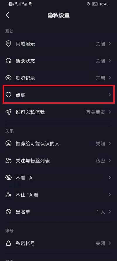 3.然后在隐私界面中点击【点赞】,进入到其中;