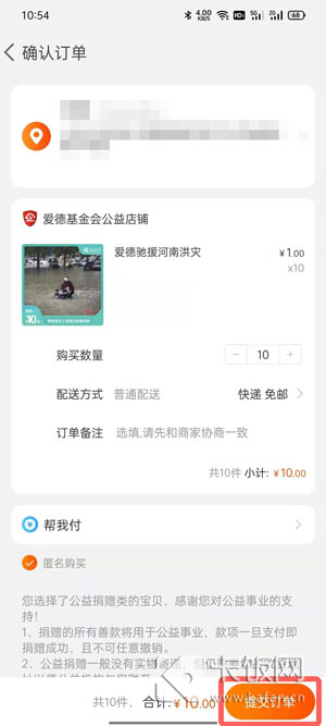 5、通过确认订单点击【提交订单】并支付,完成爱心捐赠;
