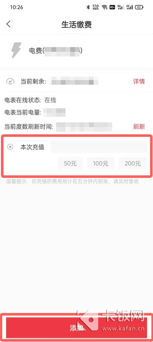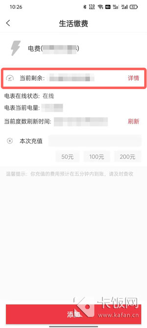 5、点击下方的【添加】后进行支付,支付完成后再返回,通过当前剩余了解剩余的电量金额。