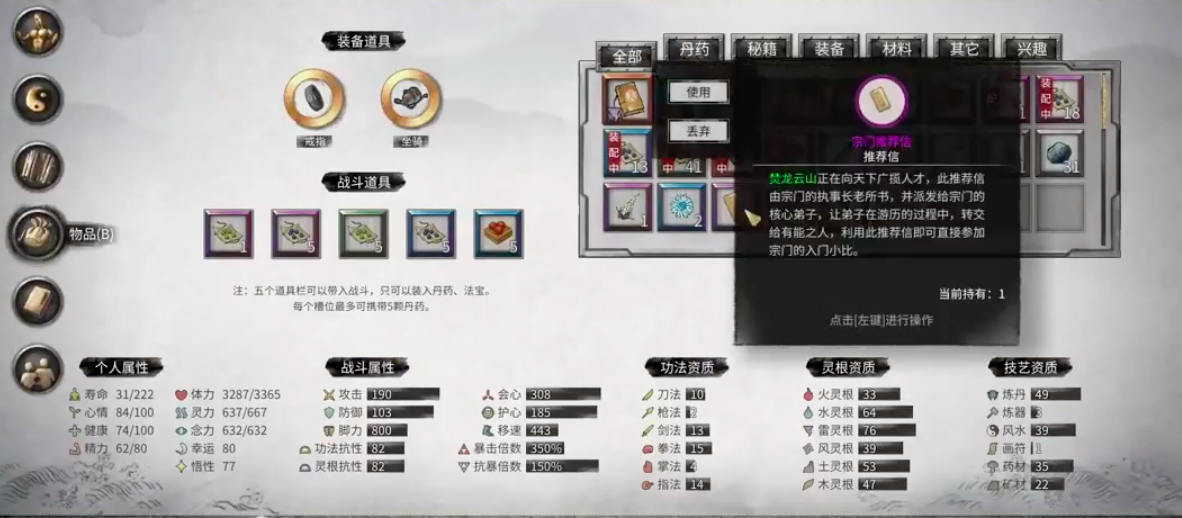 第一种方法是比较简单的,在鬼谷八荒的游戏地图当中隐藏了多个彩蛋,其中就包括道心果的获取方法,这个彩蛋位于华封州的左上角,在游戏运行方的图片上对坐标位点进行了发布,位于(94,65)玩家点击堪鱼就会出现奇遇问号,这个问号里面就有十个道心果。但目前还有一个小技巧,对于很多道点不足的朋友们有非常多的帮助。首先玩家先不要去点奇遇问号,玩家直接回到主城整到药灵点击背包,拿出宗门推荐信点击使用,之后再去点击奇遇问号就可以直接领取100个道心果。