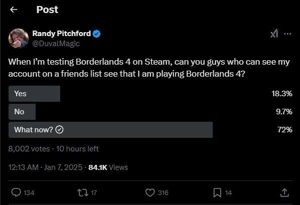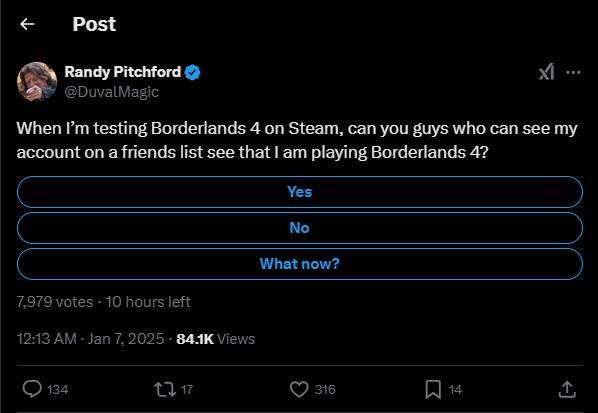 近日,Gearbox 的首席执行官 Randy Pitchford 在X上发布了一则调查问卷推文,瞬间吸引众多目光。推文中他抛出问题:“假如我正在 Steam 平台上测试《无主之地 4》,你们有谁能在好友列表中看到我的帐户信息吗?”