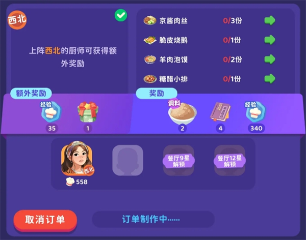 外卖订单中还有额外奖励,派遣符合要求的厨师,有可能带回调料礼包,如果外卖订单与厨师不匹配,可以选择拒绝订单,等待5分钟后刷新,这样一天有机会获得更多调料,玩家可以通过策略性地使用餐车和外卖,例如餐车主要刷几个原料的熟练度,然后去加工,其余的调料从外卖带回来的礼包中选择,以提高获取调料的效率。