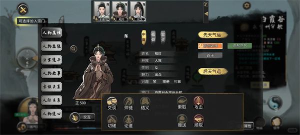 2、推荐选择仁善、无私、义气等性格,方便与NPC互动并建立深厚感情。