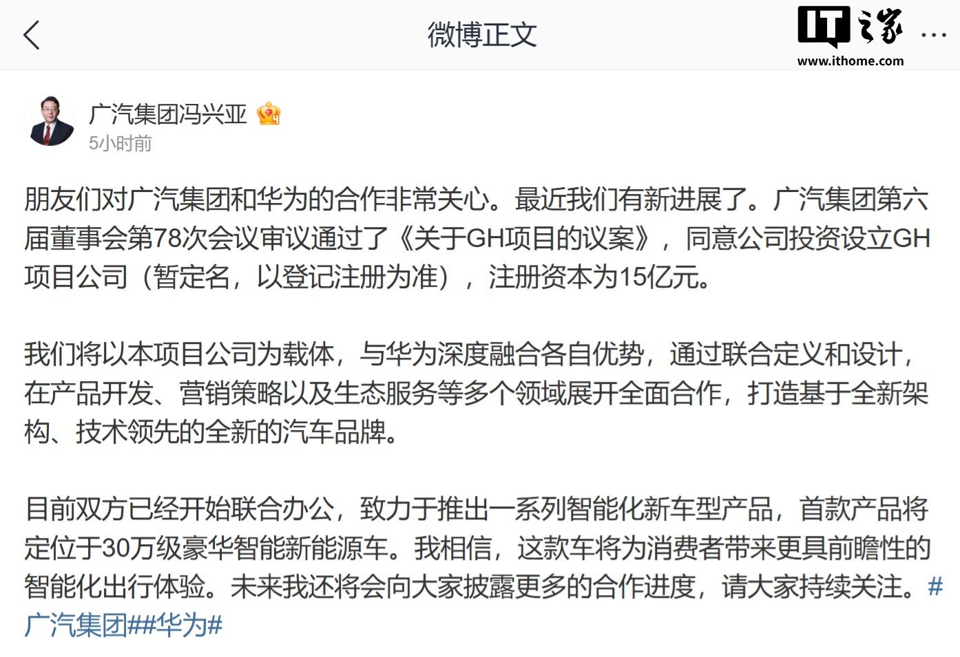 今年,华为车BU的重点将是推广大模型概念,包括端到端大模型和智能座舱大模型。据悉,广汽集团总经理冯兴亚今日公布了与华为合作的最新项目进展:双方已开始联合办公,并致力于推出一系列智能化新车型产品,首款产品将定位于30万级豪华智能新能源车。