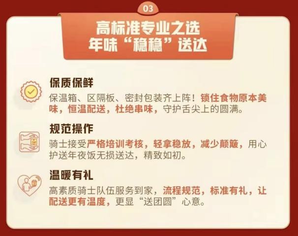 比如年夜饭场景中,精致复杂的年菜不断推陈出新,给配送逐渐“上难度”。对于承载着家人团聚、辞旧迎新情感的重要一餐,顺丰同城采用严格的配送标准,保温箱、区隔板、密封包装齐上阵,装载配送过程中稳妥放置、轻拿轻放,确保精细食材、精致摆盘完好如初,将名厨招牌菜、“功夫菜”原汁原味地送到家庭餐桌。同时,顺丰同城还灵活利用三轮车和四轮车等多元弹性运力进行接驳,以应对不同体量、不同距离的年夜饭配送需求。