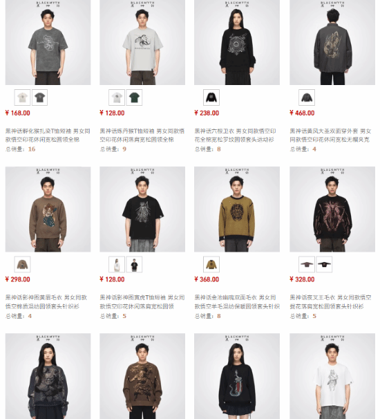 “黑神话:悟空”官方店铺还推出了印有黄眉、金池长老等角色的T恤和卫衣,这些服装的价格在78元至98元之间。除了实体店铺外,淘宝店也曾经推出过五款联名邮品,但目前已经下架。