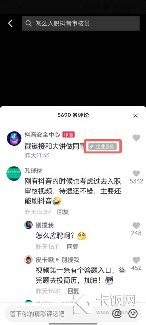 3、找到抖音安全中心发布的评论,点击【企业服务】连接进入;