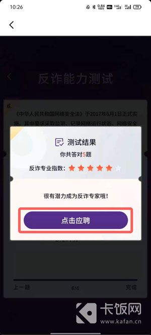 6、答对五个或者六个问题后,会出现应聘按钮,点击【点击应聘】;
