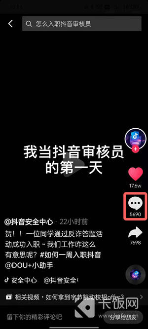 1、打开抖音搜索【抖音安全中心】,然后在主页找到“我当抖音审核员的第一天”视频;