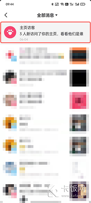 4、在全部消息中点击【主页访客】消息进入设置管理;