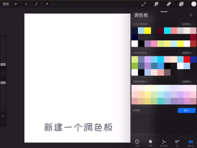 1、首先新建一个空白的画布,进入到界面中,点击右上角的调色板,再出现的界面中新建一个调色板;