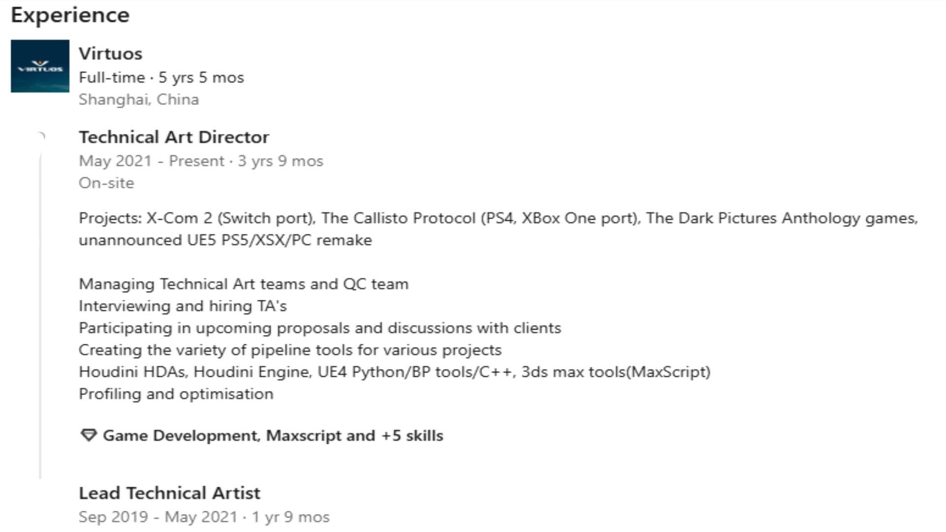 X博主“Timur222”找到了一名维塔士技术美术总监的领英简历,其最近参与的游戏项目包括《幽浮2》(Switch移植),《木卫四协议》(PS4/Xbox One移植),《黑相集》,以及一个未公布的虚幻5重制版游戏,登陆PC,PS5和Xbox Series X。