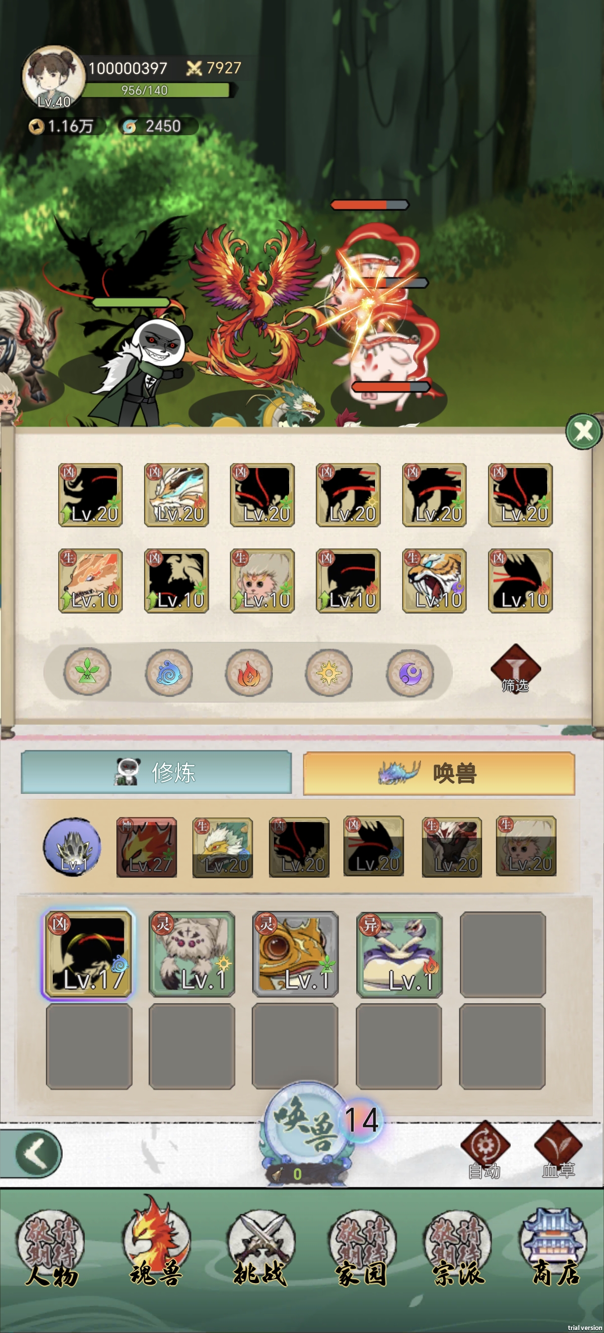 焕兽栏为10格,装满后唤兽会变味斗兽,战斗力最高的宠物会吃掉其余所有怪兽获得经验升级,每10级可以突破一次。普通突破消耗铜币,怪兽突破后可以继续升级,不改变任何属性,高级突破10分钟一次或者使用玉100/次突破,有几率高级突破成功,变成更高级的怪兽,紫色变橙色20%,橙色变红色5%。