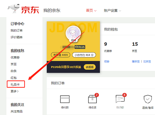 2、在我的京东页面左侧菜单中,选择我的钱包下【礼品卡】进入绑定;