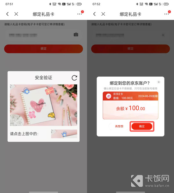 8、获取卡密码后,完成京东E卡绑定,点击【确定】即可。
