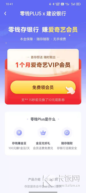 活动要求:未开通爱奇艺零钱PLUS的新用户、拥有一张建设银行的银行卡;