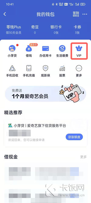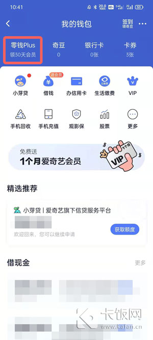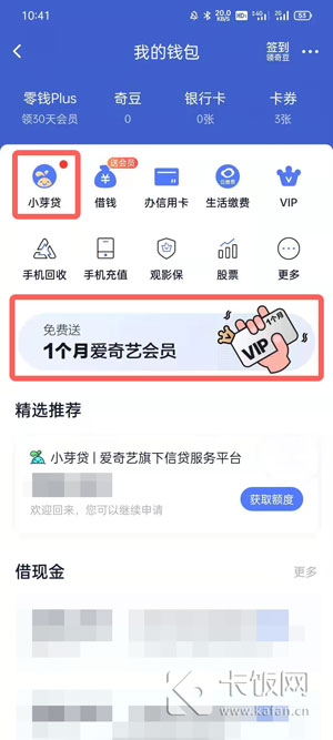 3、在钱包中点击左上角的【小芽贷】进入,或者“免费送一个月爱奇艺会员”横幅进入;