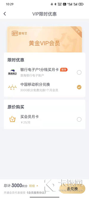 4、选择使用中国移动积分兑换会员,3000积分免费兑换1个月会员。