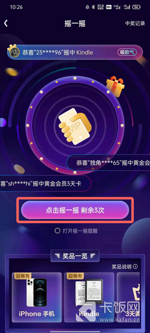 2、进入活动之后,点击【摇一摇】按钮,消耗次数摇奖励,有机会3天/1天黄金会员。