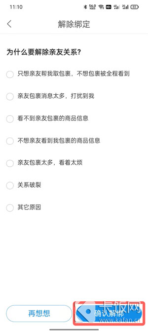 5、选择一个取消的原因,点击右下角的【确认解绑】即可完成亲友绑定。