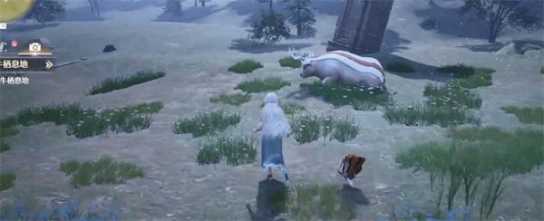 传送到废弃疯愿之子营地前哨站,落地之后走往东北方向。一直走,会看到废墟处的两根大柱子。柱子下有一只白牛,昆虫就在白牛的角上。