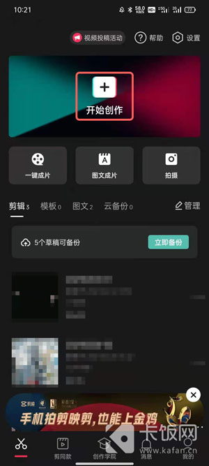 2、以剪映这款剪辑app为例,打开剪映,在首页点击【开始创作】;