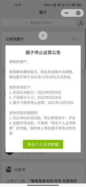Tips:微信圈子将在2021年底正式停止运营,如果经常玩圈子的朋友可以通过置顶公告来导出个人信息以免数据丢失。