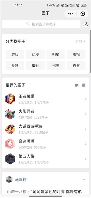 3.在圈子中可以根据分类来找圈子,或者点击上方的搜索框“搜索圈子和帖子”;