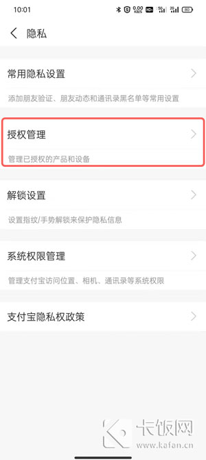 4、在隐私中,找到并点击【授权管理】,设置已授权的产品和设备;