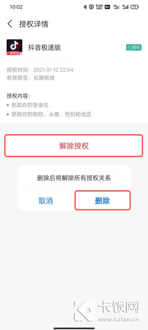 6、点击【解除授权】按钮,在弹出的提示窗口中点击【删除】完成解绑操作。
