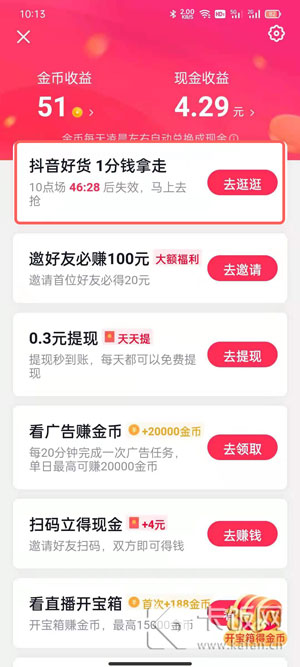 4、找到“抖音好货1分钱拿走”,点击【去逛逛】;